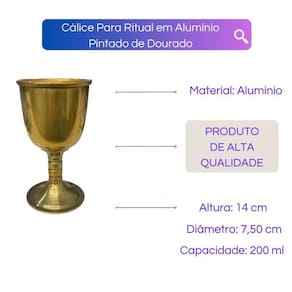 Cálice Para Ritual em Alumínio Pintado Dourado 14cm 200 ml Descubra a magia com nosso Cálice de Rituais e Missas em Alumínio. Com 14cm de altura e capacidade para 200ml, este cálice une elegância e praticidade.