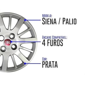 Especificações Técnicas: Produto: Jogo de Calotas com Emblemas Quantidade: 04 Calotas Aro 14 + 04 Emblemas Resinados Fiat Cor: Prata Fixação: Parafusos da roda Aplicação: Fiat Palio, Siena, Weekend todos os anos . Atenção: Não compatível com rodas de Uno que escondem a válvula pneumática. Compatibilidade: Exclusivo para rodas aro 14 da linha Fiat.