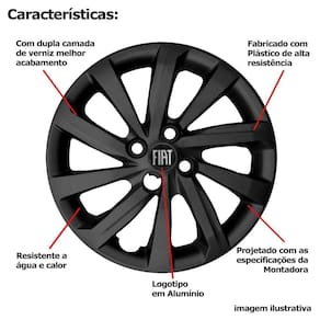 Especificações Técnicas: - Compatibilidade: Fiat Strada - Material: Plástico de alta resistência - Camada de verniz: Dupla - Resistente à água e calor - Fixação: Por parafuso - Cubo: Padrão - Cor: Preto fosco - Referência: 167Cp - Marca: Grid Calotas