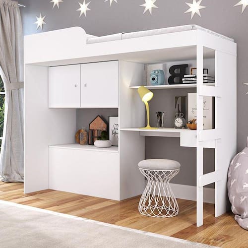 CAMA ALTA MULTIFUNCIONAL COM BAÚ E ESTAÇÃO DE TRABALHO LION BRANCO