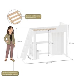 A estrutura em MDP de 1,5 cm garante estabilidade e resistência, enquanto o estrado em madeira multilaminada proporciona mais conforto e durabilidade. A cama é acessada por uma escada lateral prática e segura. No espaço inferior, você encontra uma escrivaninha com nichos integrados, perfeita para estudo ou trabalho, além de um roupeiro com duas portas e cabideiro, que facilita a organização do ambiente.