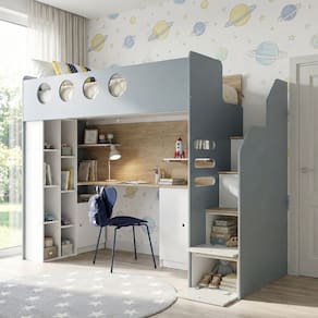 Ideal para pequenos exploradores que precisam de foco e organização, a Cama Alta Office com Armários Baixos redefine o conceito de aproveitamento de espaço. A parte inferior da estrutura elevada é preenchida por módulos de armazenamento que eliminam a necessidade de móveis extras, criando um ambiente clean e funcional. A durabilidade é assegurada pela estrutura em MDF de 15 mm, protegida por uma pintura UV resistente ao uso contínuo. O toque de personalização fica por conta do painel perfurado, onde a prateleira móvel pode ser instalada em diferentes alturas para acomodar as criações da criança. Complementando o design, a escada multifuncional com portas basculantes em cada degrau oferece um esconderijo perfeito para tesouros e livros, tornando a rotina de organização uma etapa natural e prazerosa do desenvolvimento.