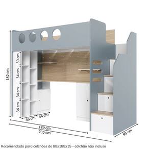 Informações Complementares: Cama alta suporta 120kg, Nichos verticais 5kg cada, prateleiras móveis 5kg, prateleiras fixas 10kg, tampo da escrivaninha 20kg. Produto não é personalizavel, ou seja, todas as peças enviadas devem ser montadas para não comprometer a estrutura do móvel.