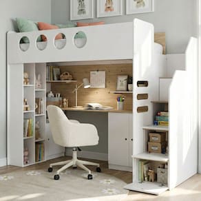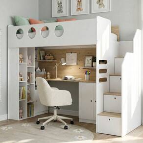 Ideal para pequenos exploradores que precisam de foco e organização, a Cama Alta Office com Armários Baixos redefine o conceito de aproveitamento de espaço. A parte inferior da estrutura elevada é preenchida por módulos de armazenamento que eliminam a necessidade de móveis extras, criando um ambiente clean e funcional. A durabilidade é assegurada pela estrutura em MDF de 15 mm, protegida por uma pintura UV resistente ao uso contínuo. O toque de personalização fica por conta do painel perfurado, onde a prateleira móvel pode ser instalada em diferentes alturas para acomodar as criações da criança. Complementando o design, a escada multifuncional com portas basculantes em cada degrau oferece um esconderijo perfeito para tesouros e livros, tornando a rotina de organização uma etapa natural e prazerosa do desenvolvimento.