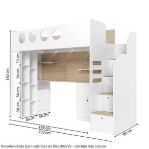 Informações Complementares: Cama alta suporta 120kg, Nichos verticais 5kg cada, prateleiras móveis 5kg, prateleiras fixas 10kg, tampo da escrivaninha 20kg. Produto não é personalizavel, ou seja, todas as peças enviadas devem ser montadas para não comprometer a estrutura do móvel.
