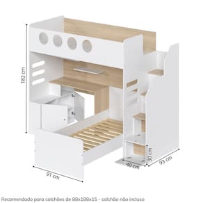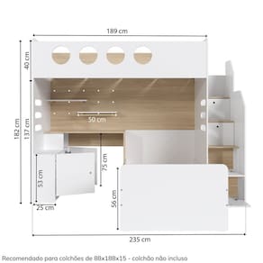 Informações Complementares: Cama alta suporta 120kg, Cama de solteiro 100kg, prateleiras móveis 5kg, prateleiras fixas 10kg, tampo da escrivaninha 20kg. Produto não é personalizavel, ou seja, todas as peças enviadas devem ser montadas para não comprometer a estrutura do móvel. Altu
