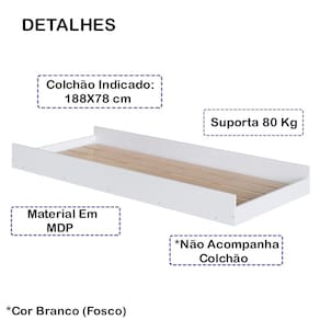 A Cama Auxiliar é perfeita para a acomodação dos seus visitantes, hospedes, e seus familiares. Estrutura em MDP de 15 mm, e excelente acabamento em Finish Foil (Fosco). Possuí estrado fixo e rodízios plásticos com chapa metálica em sua parte inferior para melhor movimentação. Pode ser utilizada em diversos modelos de cama solteiro, basta certificar as medidas para o encaixe antes da compra do produto. O colchão indicado para a Cama é de 188x78 cm (Não Acompanha Colchão). Cama suporta até 80 kg distribuídos. Este móvel chegará em sua casa separado em 01 volume.