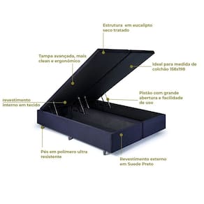 Não é recomendado abrir e fechar o baú sem o colchão sobre o mesmo, isso acarretara no mau funcionamento do Baú Acompanha Cama Auxiliar: Não Ambiente Principal: Quarto Cantoneiras: Sim Cor: Preto Cor do Produto: Preto Itens Inclusos: 1 Cama Baú Queen size Material da Estrutura: Eucalipto Material dos Pés: Plástico Necessita Montagem: Não Origem do Produto: Nacional Peso: 80 Possui Baú: Sim Recomendações de Uso, Manutenção e Limpeza: Produto de fácil montagem, só precisa fazer a fixação dos pés. É recomendado fazer a limpeza da base apenas com pano umedecido. Revestimento da Base Box: Suede Tamanho do Produto: Queen Marca: B&G
