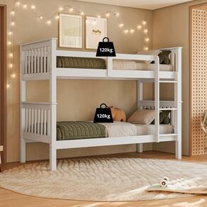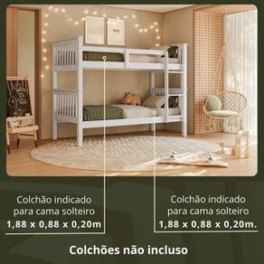 Material: Madeira Maciça de Pinus de Reflorestamento e MDF de 2,2cm de espessura Pintura/Acabamento: Pu Branco /Castanho e UV 30% brilho (deixando aparente os veios da madeira) Para Colchões de Dimensões (cm x cm): 188x88 Colchão: Não incluso Peso Suportado : 120 Kg por cama Acessórios: Escada Fixa Altura entre camas: 86cm