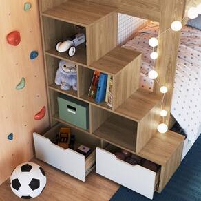 A Cama Beliche Infantil Bicama para Menino e Menina 2,32m com Escada, Nichos e Gavetas com Rodas da Completa Móveis transforma o quarto da criança em um espaço encantador, com escadas laterais que oferecem praticidade na subida e descida dos pequenos, a cama beliche é perfeita para otimizar o espaço. Cada degrau possui nichos integrados, proporcionando solução inteligente para guardar e organizar brinquedos, livros e outros acessórios. Além disso, os dois últimos são acompanhados por gavetas, tornando o produto ainda mais completo. A Cama Beliche da Completa Móveis oferece a flexibilidade de montar a escada lateral tanto do lado direito quanto do lado esquerdo, adaptando-se às necessidades do ambiente.