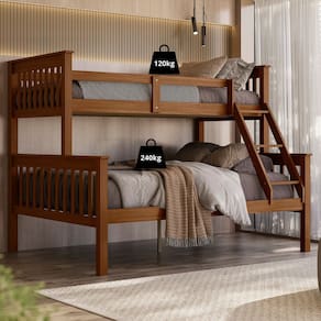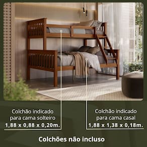 Detalhes do produto: Modelo: WB105 Material: Madeira Maciça de Pinus de Reflorestamento e MDF de 2,2cm de espessura Pintura/Acabamento: PU e UV 30% brilho Medidas dos Colchões da Cama de Solteiro (cm x cm): 188x88x20 (Não Incluso) Medidas dos Colchões da Cama de Casal (cm x cm): 188x138x18 (Não Incluso) Peso Suportado Cama de Solteiro: 120 Kg Peso Suportado Cama de Casal: 240 Kg Acessórios: Escada Fixa Altura entre camas: 86cm