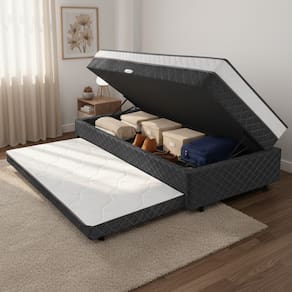 A Cama Bibox Gabi com baú une conforto e praticidade em um único móvel. Com estrutura firme e suporte ortopédico, oferece a sustentação ideal para uma noite de sono reparadora, suportando até 80 kg por pessoa. Conta ainda com uma cama auxiliar, perfeita para acomodar visitas com facilidade, e um amplo baú, ideal para organizar mantas, travesseiros e outros itens. É uma escolha que combina estilo, funcionalidade e conforto, tornando-se o destaque perfeito para qualquer ambiente.