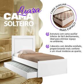 CARACTERÍSTICAS TÉCNICAS Tipo: Bicama solteiro Modelo: Luara Cor: Branco Material: MDF/MDP Tipo de pintura: UV Fosco Possui cama auxiliar: Sim Cabeceira com detalhe em relevo; Suporte anti ruído; Acompanha 2 colchões D23; Cama principal suporta até 90 kg; Colchões suportam até 70 kg;