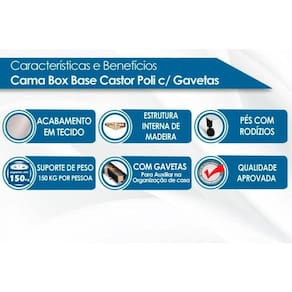 Características Gerais da Cama Box - Não acompanha Cantoneira Características Internas Cama Box - Estrutura de Madeira Forração Revestimento da Cama Box - Tecido Suporte de Peso da Cama Box - 150 Kg Sobre os Pés para Cama Box - Pés foto ilustrativa - Pés Fixos Madeira/ABS - Pés c/ Rodízios Altura da Cama Box com os pés - 32 cm altura Outras Vantagens da Cama Box - Como Escolher o Colchão do seu Conjunto Box - Outras Informações da Cama Box Base