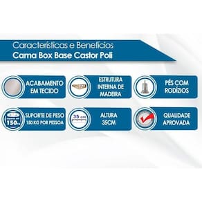Características Gerais da Cama Box - Não acompanha Cantoneira Características Internas Cama Box - Estrutura de Madeira Forração Revestimento da Cama Box - Tecido Suporte de Peso da Cama Box - 150 Kg Sobre os Pés para Cama Box - Pés foto ilustrativa - Pés Fixos ABS/PVC Altura da Cama Box com os pés - 35 cm altura Outras Vantagens da Cama Box - Como Escolher o Colchão do seu Conjunto Box - Outras Informações da Cama Box Base Sobre a Cama Box Base - Informações da Cama Box Base - Vantagens
