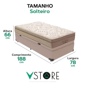 A tecnologia que a sua casa merece está na V-Store! O Conjunto Colchão Los Angeles + Base Box Baú Bravus da V-Store oferece conforto e funcionalidade. O colchão, com molas ensacadas e sistema EPS, garante suporte ideal, conforto térmico e proteção antiácaro. A base box, com amplo espaço de armazenamento, é feita de madeira reflorestada e revestida com tecido resistente, proporcionando praticidade e sofisticação ao seu quarto.Característica Do Colchão: Modelo: Los AngelesMarca: V-StoreTamanho: SolteiroDimensões: 78x28x188 (Largura x Altura x Comprimento)Conforto: MédioSistema: Molas EnsacadasPillow: Não se aplicaPeso Máximo recomendado: 150 kg (Por pessoa)Proteções: Antiácaro, antialérgico, antifungo, antimofoGarantia: 12 Meses (Espuma) / 10 anos ( Conjunto de Molas Ensacadas)Característica Da Base: Marca: V-StoreModelo: BravusCor do Box: BegeTamanho: SolteiroDimensões: 78x44x188 (Largura x Altura x Comprimento)Estrutura: MadeiraPeso máximo recomendado: 150 kg (Por Pessoa)Altura do Box: 38 cmAltura dos Pés: 6 cmAltura total: 44 cmGarantia: 12 Meses (Estrutura) / 3 meses (Tecido)Selo Ecologicamente CorretoAtenção:- Antes de finalizar sua compra, recomendamos que verifique se as dimensões do produto são adequadas para serem transportadas pelos elevadores, portas, escadas e corredores de sua residência. Ressaltamos que não nos responsabilizamos pelo transporte do produto por meios específicos, como escadas, guinchos ou içamentos.- É possível que hajam leves variações de cor de acordo com o dispositivo que está sendo utilizado como smartphones, computadores, monitores e outros.