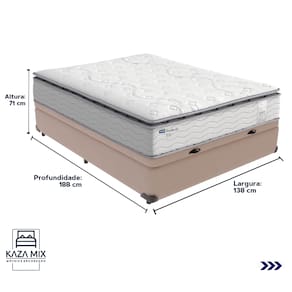 O conforto que sua casa precisa e a qualidade que você merece está na Kazamix!Colchão Probel Amsterdã – a escolha perfeita para noites de sono inigualáveis. Equipado com Molas Ensacadas Prolastic, oferece suporte individualizado, reduzindo a transferência de movimentos para um descanso mais tranquilo. Seu Pillow Top Super proporciona uma camada extra de maciez, elevando o conforto e garantindo uma experiência de luxo.Com camadas de espuma D33 e D65, o Amsterdã combina firmeza e durabilidade, enquanto as proteções antiácaro, antialérgico e antifungo criam um ambiente de sono saudável.Invista em qualidade e bem-estar com o Colchão Probel Amsterdã e transforme suas noites.Modelo: AmsterdãMarca: ProbelTamanho: CasalDimensões: 138x188X34 (Largura x Comprimento x Altura)Conforto: FirmeSistema: Molas EnsacadasPillow: Pillow TopPeso Máximo recomendado: 120 kg (Por pessoa)Proteções: Antiácaro, antialérgico, antifungo, antimofoGarantia: 1 ano pelo FabricanteO conforto que sua casa precisa e a qualidade que você merece está na KazamixAproveite cada metro quadrado do seu dormitório com a Cama Box Baú!Projetada com madeira de reflorestamento reforçada, a Cama Box Baú é a escolha ideal para quem busca otimização de espaço e praticidade na organização do dia a dia.Com um baú generoso, ela oferece a solução perfeita para armazenar travesseiros extras, cobertores, malas e muito mais. Além disso, sua estrutura robusta suporta até 150 kg por pessoa, garantindo a sustentação ideal para o seu colchão e prolongando sua vida útil.O pistão a gás robusto proporciona uma abertura suave e segura do baú, oferecendo praticidade e resistência no uso diário. Para completar, o acabamento de alta qualidade combina perfeitamente com qualquer estilo de decoração, agregando elegância e versatilidade ao seu ambiente.Não perca tempo! Adquira agora mesmo sua Cama Box Baú e diga adeus à falta de espaço e desorganização.Marca: KazaMixModelo: BaúCor do Box: BegeTamanho: CasalDimensões: 138X188X37 (Largura x Comprimento x Altura) Estrutura: MadeiraPeso máximo recomendado: 150 kg (Por Pessoa)Altura do Box: 32 cm Altura dos Pés: 5 cm Altura total: 37 cm Garantia: 03 mesesSelo Ecologicamente CorretoAtenção: Antes de finalizar sua compra, certifique-se de que as dimensões do produto sejam adequadas para serem transportadas pelos elevadores, portas, escadas e corredores de sua residência. Ressaltamos que não nos responsabilizamos pelo transporte do produto por meios específicos, como escadas, guinchos ou içamentos.