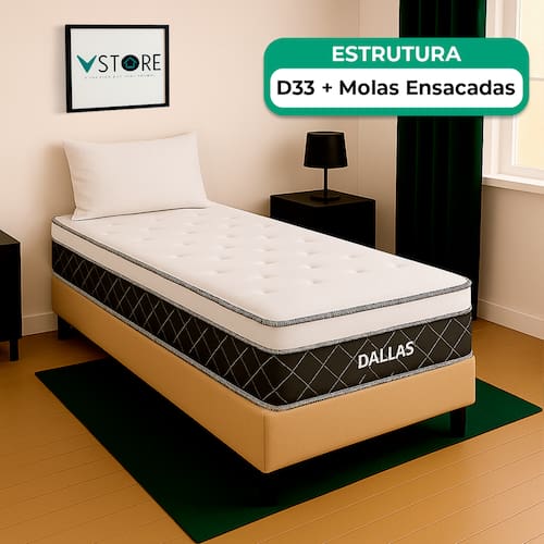 A tecnologia que a sua casa merece está na V-Store! O Conjunto Colchão Dallas e Base Box Baú Bravus combina conforto e praticidade. O colchão, com molas ensacadas, espuma D33, Euro Pillow e tecnologia EPS, oferece suporte ideal, conforto térmico, maior durabilidade e resistência. A base box baú, com estrutura reforçada e acabamento elegante, proporciona amplo espaço para armazenamento e organização do dormitório. Perfeito para quem busca qualidade, funcionalidade e sofisticação. Adquira agora e transforme suas noites de sono! Característica Do Colchão: Modelo: DallasMarca: V-StoreTamanho: SolteiroDimensões: 78x20x188 (Largura x Altura x Comprimento)Conforto: MédioSistema: Molas EnsacadasPillow: Euro PillowPeso Máximo recomendado: 150 kg (Por pessoa)Proteções: Antiácaro, antialérgico, antifungo, antimofoGarantia: 12 Meses (Espuma) / 10 anos ( Conjunto de Molas Ensacadas)Característica Da Base: Marca: V-StoreModelo: BravusCor do Box: BegeTamanho: SolteiroDimensões: 78x44x188 (Largura x Altura x Comprimento)Estrutura: MadeiraPeso máximo recomendado: 150 kg (Por Pessoa)Altura do Box: 38 cmAltura dos Pés: 6 cmAltura total: 44 cmGarantia: 12 Meses (Estrutura) / 3 meses (Tecido)Selo Ecologicamente CorretoAtenção:- Antes de finalizar sua compra, recomendamos que verifique se as dimensões do produto são adequadas para serem transportadas pelos elevadores, portas, escadas e corredores de sua residência. Ressaltamos que não nos responsabilizamos pelo transporte do produto por meios específicos, como escadas, guinchos ou içamentos.- É possível que hajam leves variações de cor de acordo com o dispositivo que está sendo utilizado como smartphones, computadores, monitores e outros.