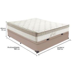O conforto que sua casa precisa e a qualidade que você merece está na Kazamix!O Colchão King Best Anjos é a escolha ideal para quem busca um sono profundo e revigorante. Com sua espuma D28 de alta performance e o inovador sistema de Molas Ensacadas, ele oferece o equilíbrio perfeito entre conforto intermediário e suporte individualizado, adaptando-se ao formato do seu corpo para garantir noites mais tranquilas. O Pillow Euro, com sua camada extra de espuma, proporciona um toque adicional de conforto e alívio dos pontos de pressão.O sistema No Turn oferece praticidade, pois não é necessário virar o colchão, mantendo seu desempenho sempre impecável. Além disso, os tratamentos antiácaro e antialérgico criam um ambiente saudável, ideal para quem busca um descanso livre de impurezas.Desfrute da combinação de durabilidade, conforto e qualidade com o Colchão King Best Anjos e invista no seu bem-estar. Uma escolha que transforma suas noites em momentos de descanso incomparáveisModelo: King Best BegeMarca: AnjosTamanho: CasalDimensões: 138x188X28 (Largura x Comprimento x Altura)Conforto: IntermediárioSistema: Molas EnsacadasPillow: Euro PillowPeso Máximo recomendado: 130 kg (Por pessoa)Proteções: Antiácaro, antialérgico, antifungo, antimofoGarantia: 1 ano pelo FabricanteO conforto que sua casa precisa e a qualidade que você merece está na KazamixAproveite cada metro quadrado do seu dormitório com a Cama Box Baú!Projetada com madeira de reflorestamento reforçada, a Cama Box Baú é a escolha ideal para quem busca otimização de espaço e praticidade na organização do dia a dia.Com um baú generoso, ela oferece a solução perfeita para armazenar travesseiros extras, cobertores, malas e muito mais. Além disso, sua estrutura robusta suporta até 150 kg por pessoa, garantindo a sustentação ideal para o seu colchão e prolongando sua vida útil.O pistão a gás robusto proporciona uma abertura suave e segura do baú, oferecendo praticidade e resistência no uso diário. Para completar, o acabamento de alta qualidade combina perfeitamente com qualquer estilo de decoração, agregando elegância e versatilidade ao seu ambiente.Não perca tempo! Adquira agora mesmo sua Cama Box Baú e diga adeus à falta de espaço e desorganização.Marca: KazaMixModelo: BaúCor do Box: BegeTamanho: CasalDimensões: 138X188X37 (Largura x Comprimento x Altura) Estrutura: MadeiraPeso máximo recomendado: 150 kg (Por Pessoa)Altura do Box: 32 cm Altura dos Pés: 5 cm Altura total: 37 cm Garantia: 03 mesesSelo Ecologicamente CorretoAtenção: Antes de finalizar sua compra, certifique-se de que as dimensões do produto sejam adequadas para serem transportadas pelos elevadores, portas, escadas e corredores de sua residência. Ressaltamos que não nos responsabilizamos pelo transporte do produto por meios específicos, como escadas, guinchos ou içamentos.