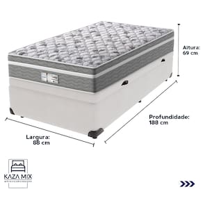 O conforto que sua casa precisa e a qualidade que você merece está na Kazamix!O Colchão Evolution é a escolha ideal para quem busca conforto, suporte e qualidade em cada noite de sono. Com Molas Ensacadas que oferecem um suporte individualizado, e um Pillow Euro que proporciona uma camada extra de suavidade, esse colchão transforma seu descanso em uma experiência de luxo.Com espuma D28 de alta densidade, o Evolution garante firmeza e conforto duradouros. Seu acabamento em poliéster diamante e bordado em matelassê trazem um toque de elegância e sofisticação ao seu ambiente.Além disso, o colchão é tratado com propriedades antiácaro e antialérgico, garantindo um sono mais saudável e seguro.Invista no seu bem-estar com o colchão Evolution, e experimente a combinação perfeita de conforto e durabilidade!Modelo: EvolutionMarca: ProbelTamanho: SolteiroDimensões: 88x188X32 (Largura x Comprimento x Altura)Conforto: IntermediárioSistema: Molas EnsacadasPillow: Euro PillowPeso Máximo recomendado: 110 kg (Por pessoa)Proteções: Antiácaro, antialérgico, antifungo, antimofoGarantia: 1 ano pelo FabricanteO conforto que sua casa precisa e a qualidade que você merece está na KazamixAproveite cada metro quadrado do seu dormitório com a Cama Box Baú!Projetada com madeira de reflorestamento reforçada, a Cama Box Baú é a escolha ideal para quem busca otimização de espaço e praticidade na organização do dia a dia.Com um baú generoso, ela oferece a solução perfeita para armazenar travesseiros extras, cobertores, malas e muito mais. Além disso, sua estrutura robusta suporta até 150 kg por pessoa, garantindo a sustentação ideal para o seu colchão e prolongando sua vida útil.O pistão a gás robusto proporciona uma abertura suave e segura do baú, oferecendo praticidade e resistência no uso diário. Para completar, o acabamento de alta qualidade combina perfeitamente com qualquer estilo de decoração, agregando elegância e versatilidade ao seu ambiente.Não perca tempo! Adquira agora mesmo sua Cama Box Baú e diga adeus à falta de espaço e desorganização.Marca: KazaMixModelo: BaúCor do Box: BrancoTamanho: SolteiroDimensões: 88X188X37 (Largura x Comprimento x Altura) Estrutura: MadeiraPeso máximo recomendado: 150 kg (Por Pessoa)Altura do Box: 32 cm Altura dos Pés: 5 cm Altura total: 37 cm Garantia: 03 mesesSelo Ecologicamente CorretoAtenção: Antes de finalizar sua compra, certifique-se de que as dimensões do produto sejam adequadas para serem transportadas pelos elevadores, portas, escadas e corredores de sua residência. Ressaltamos que não nos responsabilizamos pelo transporte do produto por meios específicos, como escadas, guinchos ou içamentos.