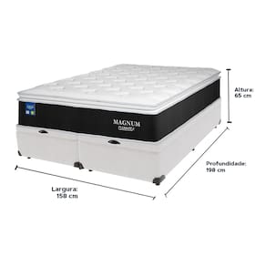O conforto que sua casa precisa e a qualidade que você merece está na Kazamix!Descubra o colchão Magnum da Plumatex, a escolha ideal para quem busca conforto, suporte e qualidade. Com tecnologia avançada, o Magnum combina o melhor em materiais e design para proporcionar uma experiência de sono única.O colchão conta com uma camada de Malha Chronos 180 g/m², que oferece um toque macio e agradável. As Molas Ensacadas garantem suporte personalizado e distribuem o peso de forma uniforme, minimizando a transferência de movimento. A Espuma D26 oferece firmeza e conforto duradouro, enquanto o EPS Pillow Top Hig|h Tech adiciona um toque luxuoso, elevando ainda mais a experiência de descanso.Com proteção antiácaro, antialérgico e antifungo, o Magnum assegura um ambiente saudável para o seu sono. Ideal para quem deseja um colchão durável e de alta performance.Invista no seu bem-estar e experimente o conforto excepcional do Magnum.Modelo: MagnumMarca: PlumatexTamanho: QueenDimensões: 158x198X28 (Largura x Comprimento x Altura)Conforto: IntermediárioSistema: Molas EnsacadasPillow: Pillow TopPeso Máximo recomendado: 110 kg (Por pessoa)Proteções: Antiácaro, antialérgico, antifungo, antimofoGarantia: 1 ano pelo FabricanteO conforto que sua casa precisa e a qualidade que você merece está na KazamixAproveite cada metro quadrado do seu dormitório com a Cama Box Baú!Projetada com madeira de reflorestamento reforçada, a Cama Box Baú é a escolha ideal para quem busca otimização de espaço e praticidade na organização do dia a dia.Com um baú generoso, ela oferece a solução perfeita para armazenar travesseiros extras, cobertores, malas e muito mais. Além disso, sua estrutura robusta suporta até 150 kg por pessoa, garantindo a sustentação ideal para o seu colchão e prolongando sua vida útil.O pistão a gás robusto proporciona uma abertura suave e segura do baú, oferecendo praticidade e resistência no uso diário. Para completar, o acabamento de alta qualidade combina perfeitamente com qualquer estilo de decoração, agregando elegância e versatilidade ao seu ambiente.Não perca tempo! Adquira agora mesmo sua Cama Box Baú e diga adeus à falta de espaço e desorganização.Marca: KazaMixModelo: BaúCor do Box: BrancoTamanho: QueenDimensões: 158X198X37 (Largura x Comprimento x Altura) Estrutura: MadeiraPeso máximo recomendado: 150 kg (Por Pessoa)Altura do Box: 32 cm Altura dos Pés: 5 cm Altura total: 37 cm Garantia: 03 mesesSelo Ecologicamente CorretoAtenção: Antes de finalizar sua compra, certifique-se de que as dimensões do produto sejam adequadas para serem transportadas pelos elevadores, portas, escadas e corredores de sua residência. Ressaltamos que não nos responsabilizamos pelo transporte do produto por meios específicos, como escadas, guinchos ou içamentos.