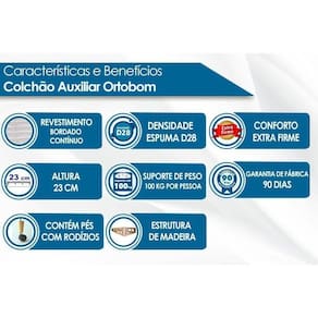 Dimensões(Cm): Comprimento(Profundidade): 171cm x Largura: 79cm x Altura: 23cm Características Gerais da Cama Auxiliar - Pés c/ Rodízios Forração de Revestimento Superior da Cama Auxiliar - Tecido de Alta Qualidade Forração de Revestimento da Lateral da Cama Auxiliar - Alta Qualidade Tipo de bordado do tecido da lateral da Cama Auxiliar - Alta Qualidade Tipo de bordado do tecido superior da Cama Auxiliar - Contínuo Altura da Cama Auxiliar com os pés - 23 Características Gerais da Cama Box - Não acompanha Cantoneira Sobre os Pés para Cama Box - Pés foto ilustrativa