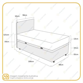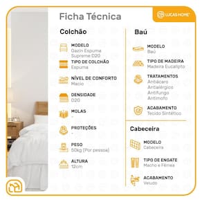 Especificações Técnicas Baú: - Marca: Lucas Home; - Material: Madeira tratada; - Peso máximo recomendado: até 150 Kg (por pessoa); - Altura do baú: 37cm; - Profundidade do baú: 27cm; - Altura dos pés: 5cm; - Revestimento da Cama: Material Sintético; - Garantia: 12 meses de garantia; - Dimensões do produto (largura x comprimento x altura) 88x188x42cm.