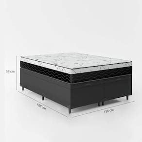 Cama Box Baú Casal 138 Bipartido com Colchão Espuma D33 One Face PretoO colchão One Face é compostos por poliestireno expandido ( EPS) que juntamente com a espuma de Densidade D33 são responsáveis por toda a sustentação do peso. Eles são indicados para aqueles que sentem dores nas costas em relação aos outros tipos de colchões no Mercado. Famoso pela durabilidade, também suportam mais pesos e são recomendadas para aqueles que procuram um colchão com mais firmeza. Já a cama baú é uma ótima opção para quem busca praticidade e economia de espaço, podendo guardar cobertores, jogos de cama, travesseiros. São duas camas de 69cm cada que juntas foram uma cama da casal de 138cm.Informações do Colchão: 1. Tecido de revestimento: Poliéster Bordado; 2. Cor: Branco c/ Preto; 3. Modelo: One Face (uma face); 4. Tamanho: Altura: 17 cm, Largura: 138 cm, Comprimento: 188 cm. 5. Peso limite: 120 kg por pessoa. 6. Peso do produto: 4,6 kg 7. Material de estrutura: Espuma D33 e EPS. 8. Tipo de conforto: Intermediário Firme. 9. Garantia: 3 meses. 10. Marca: Bello Box.Especificações Técnicas Baú:- Material: Madeira tratada. - Proteções: Antiácaro - Antialérgico - Antifungo – Antimofo. - Peso máximo recomendado: até 100kg (por pessoa). - Altura do baú: 41cm (35cm c/ 6cm dos pés).- Revestimento: Tecido Sintético.- Cor: Preto.- Marca: Bello Box.- Quantidade de Pés: 12 pés.- Material dos pés: plástico.- Garantia: 3 meses. - Dimensões do produto (altura x largura x comprimento) Casal: 41x138x188cm. Importante:- As imagens ambientadas são meramente ilustrativas e podem apresentar itens que não compõe o produto;- As cores do produto podem variar de acordo com o monitor, a iluminação do ambiente ou sua percepção visual;- Não nos responsabilizamos em subir pelas escadas ou içar o produto.- Montagens, desmontagens e instalações são responsabilidades do cliente. Estes serviços não estão inclusos no valor do produto. Para evitar imprevistos na sua entrega, confira as dimensões do produto no momento da compra e certifique-se de que ele passará por elevadores, portas, escadas e corredores.