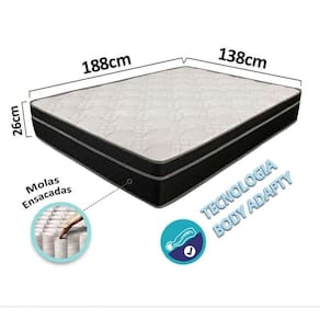 Cama Box Baú Casal 138 Tecido Sintético Preto Com Colchão Paris De Molas Ensacadas Preto 67x138x188 Cama Box Baú Casal 138 Tecido Sintético Preto com Colchão de Molas Ensacadas Preto ;26x138x188.Um colchão que se encaixa em todos os gostos e proporciona noites agradáveis de sono. As molas ensacadas, unidas ao toque suave e espuma de alta performance irão proporcionar o conforto que você tanto deseja. ;- Base com estrutura produzida em madeira de reflorestamento tratada.- Tratamento: Antialérgico e Antiácaro- Pistão a Gás: (Maior durabilidade e maior facilidade no manuseio)- Contém 02 puxadores, para maior facilidade na abertura.- Contém 01 Arco na parte de trás para o colchão não escorregar. ;Características do Box:- Marca: Bello Box .- Dimensões aproximadas do produto:- Altura c/ os pés: 40 cm.- Largura: 138 cm.- Profundidade: 188 cm.- Modelo : Base Box com Baú ;Casal 138.- Material interno: Madeira.- Revestimento externo: Tecido sintético.- Cor: Preto.- Garantia: 3 Meses.- Tamanho: Casal.- Modelo: Bases para Cama Box. ;Características do Colchão:Tamanho: casal.Altura: 26cm.Largura: 138cm.Comprimento: 188cm.Conforto: Macio.Estrutura: Mola Ensacada.Suporte: 120kg por pessoa.Revestimento: Poliéster/Bordado.Cor: Preto.Garantia: 3 meses.Proteções: Antiácaro, Antialérgico, Antifungo e Antimofo. ;Atenção a entrega:-As ;imagens ambientadas ;são meramente ilustrativas e podem apresentar itens que não compõe o produto.- As ;cores do produto ;podem variar de acordo com o monitor, a iluminação do ambiente ou sua percepção visual.- Confira as dimensões do produto no momento da compra e certifique-se que o item passará normalmente por elevadores, portas, escadas e/ou corredores, evitando assim descontentamentos futuros .- Não nos responsabilizamos por montagens, desmontagens e instalações.- Não subimos produtos por escadas e elevadores.