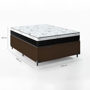 Cama Box Baú Casal 138 Tecido Sintético Marrom Com Colchão Espuma D33 One Face Preto - Bello Box - 58x138x188 Cama Box Baú Casal 138 com Colchão Espuma D33 One Face PretoO colchão One Face ; é ;compostos por poliestireno expandido ( EPS) que juntamente com a espuma de Densidade D33 são responsáveis por toda a sustentação do peso. Eles são indicados para aqueles que sentem dores nas costas em relação aos outros tipos de colchões no Mercado. Famoso pela durabilidade, também suportam mais pesos e são recomendadas para aqueles que procuram um colchão com mais firmeza. ; Já a cama baú é uma ótima opção para quem busca praticidade e economia de espaço, podendo guardar cobertores, jogos de cama, travesseiros.Informações do Colchão: ;1. Tecido de revestimento: Poliéster Bordado; ; ;2. Cor: Branco c/ Preto; ; ;3. Modelo: One Face (uma face); ; ;4. Tamanho: Altura: 17 cm, Largura: 138 cm, Comprimento: 188 cm. ; ;5. Peso limite: 120 kg por pessoa. ; ;6. Peso do produto: 4,6 kg ; ;7. Material de estrutura: Espuma D33 e EPS. ;8. Tipo de conforto: Intermediário Firme. ;9. Garantia: 3 meses. ;10. Marca: Bello Box.Especificações Técnicas Baú:- Material: Madeira tratada. ;- Proteções: ;- - . ;- Peso máximo recomendado: até 100kg (por pessoa). ;- Altura do baú: 41cm (35cm c/ 6cm dos pés).- Revestimento: Tecido Sintético.- Cor: Marrom.- Marca: Bello Box.- Quantidade de Pés: 6 pés.- Material dos pés: plástico.- Garantia: 3 meses. ;- Dimensões do produto (altura x largura x comprimento) Casal: 41x138x188cm. ;Importante:- As ;imagens ambientadas ;são meramente ilustrativas e podem apresentar itens que não compõe o produto;- As ;cores do produto ;podem variar de acordo com o monitor, a iluminação do ambiente ou sua percepção visual;- Não nos responsabilizamos em subir pelas escadas ou içar o produto.- Montagens, desmontagens e instalações são responsabilidades do cliente. Estes serviços não estão inclusos no valor do produto. Para evitar imprevistos na sua , confira as dimensões do produto no momento da compra e certifique-se de que ele passará por elevadores, portas, escadas e corredores.