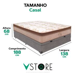 A tecnologia que a sua casa merece está na V-Store! O colchão Victory Solteiro da V-Store oferece noites de sono tranquilas e confortáveis, com seu toque macio e sistema de molas ensacadas que garantem suporte ideal e independência de movimentos. O Pillow Euro Pillow proporciona ainda mais suavidade, enquanto a tecnologia EPS adiciona resistência e durabilidade. Com proteções contra ácaros, fungos, mofo e alergias, ele garante um ambiente de sono saudável. Suporta até 150 kg por pessoa e tem garantia de 12 meses.A Base Box Baú Bravus da V-Store combina praticidade e sofisticação, com madeira reflorestada e revestimento sintético que facilitam a manutenção. Seu design otimiza o espaço de armazenamento e oferece resistência, suportando até 150 kg por pessoa. Com 44 cm de altura total e Selo Ecologicamente Correto, ela é ideal para quem busca sustentabilidade e qualidade. Transforme seu quarto com o colchão Victory e a Base Box Baú Bravus da V-Store!Característica Do Colchão: Modelo: VictoryMarca: V-StoreTamanho: CasalDimensões: 138x30x188 (Largura x Altura x Comprimento)Conforto: MédioSistema: Molas EnsacadasPillow: Euro PillowPeso Máximo recomendado: 150 kg (Por pessoa)Proteções: Antiácaro, antialérgico, antifungo, antimofoGarantia: 12 Meses (Espuma) / 10 anos ( Conjunto de Molas Ensacadas)Característica Da Base: Marca: V-StoreModelo: BravusCor do Box: CinzaTamanho: CasalDimensões: 138x44x188 (Largura x Altura x Comprimento)Estrutura: MadeiraPeso máximo recomendado: 150 kg (Por Pessoa)Altura do Box: 38 cmAltura dos Pés: 6 cmAltura total: 44 cmGarantia: 12 Meses (Estrutura) / 3 meses (Tecido)Selo Ecologicamente CorretoAtenção:- Antes de finalizar sua compra, recomendamos que verifique se as dimensões do produto são adequadas para serem transportadas pelos elevadores, portas, escadas e corredores de sua residência. Ressaltamos que não nos responsabilizamos pelo transporte do produto por meios específicos, como escadas, guinchos ou içamentos.- É possível que hajam leves variações de cor de acordo com o dispositivo que está sendo utilizado como smartphones, computadores, monitores e outros.