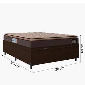; DIMENSÕES: A: 60 cm / 54 cm (sem pés) L: 138 cm P: 188 cm | MODELO:: Cama Box Baú Casal Millenium | MARCA:: Hellen | COR:: Marrom | TECIDO BOX:: Suede Veludo | PÉS:: 6 | ALTURA DOS PÉS:: 6cm | REVESTIMENTO TECIDO SUPERIOR COLCHÃO:: Tecido Granite 100% Poliéster | REVESTIMENTO INTERIOR COLCHÃO:: Tampo em tecido Jacquard, Espuma Macia, Tecido antiderrapante | PILLOW/EURO:: Pillow Top | REVESTIMENTO TECIDO LATERAL COLCHÃO:: Tecido Jacquard | ESPUMA:: D33 aliada com o EPS que faz com que o colchão suporte até 120kg por pessoa | PESO SUPORTADO:: 120kg por pessoa | PESO:: 69,32KG | ITENS INCLUSOS:: 1 Colchão de 1,38m e 1 box baú de 1,38m | GARANTIA BOX:: 3 meses pelo fabricante | INSTRUÇÕES / CUIDADOS:: Utilizar em local seco com passagem de ar, não dobrar, fazer giro quinzenalmente no sentido pés/cabeceira. | GARANTIA COLCHÃO:: 12 Meses pelo Fabricante | AVISO: não inclusa! mos até a porta de entrada da casa do cliente ou até a portaria do condomínio. Foto ilustrativa. A percepção das cores pode ser um pouco diferente da mostrada na foto do anúncio em função da luminosidade do ambiente. | TAMANHO DA CAMA: A: 60 cm / 54 cm (sem pés) L: 138 cm P: 188 cm | Classificação da Cama: Casal | TIPO DE CAMA: Cama Box Baú Casal Colchão Espuma Cor: Marrom