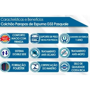 Dimensões(Cm): Comprimento(Profundidade): 188cm x Largura: 138cm x Altura: 20cm Vantagens Extras de Colchão - Ecologicamente Correto Tecido com Tratamento do Colchão - AntiÁcaro e AntiFungo Bordado do Revestimento do Colchão - Matelassê Forração Revestimento do Colchão - Poliéster - Granitê Modo de Utilização do Colchão - Double Side Camadas Interna do Estofamento de Espuma do Colchão - Alta Qualidade Densidade da Espuma do Colchão - D33 Nível de Firmeza do Colchão - Macio c/ Firmeza Peso Máximo Suportado do Colchão - 110 kg Certificação de Qualidade do Colchão - Qualidade Aprovada - INMETRO - Qualidade Costa Rica Nossa Avaliação do Colchão - Qualidade Muito Boa Tempo de Garantia do Colchão - 12 meses