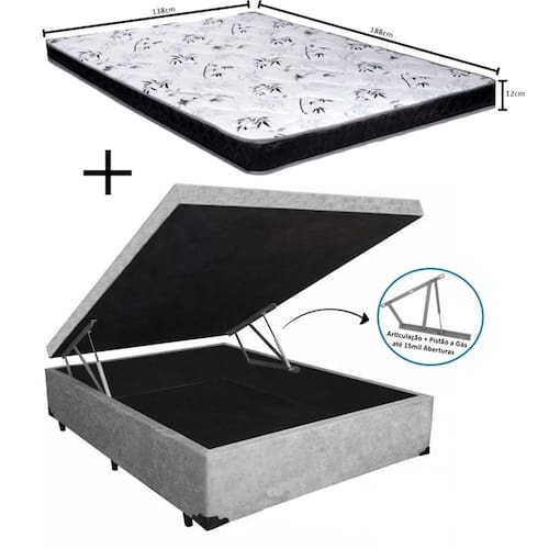 Cama Box Baú é produzida com os melhores materiais, proporcionando uma alta resistência e durabilidade prolongada. Proporcionando praticidade e conforto, tornando-se uma peça que pode ser combinada com a decoração de seu quarto deixando-o moderno e sofisticado. **As cores do produto podem variar de acordo com o monitor, a iluminação do ambiente e a sua percepção visual.** **Confira as dimensões do produto e certifique-se de que passará normalmente por supostos elevadores, portas, escadas e/ou corredores de sua residência** Características do Box: - Estrutura Interna: Estrutura em madeira 100% de Reflorestamento - Estrutura Externa: Cinza - Tratamento Antiácaro: Sim - Tratamento Antialérgico: Sim - Saida de Ventilação: Sim - Ortopédico: Não - Tecido Antiderrapante: Não - Suporta até (kg): 135 Kg - Necessita Montagem: Não - Ambiente: Quarto - Altura: 35 cm - Largura: 138 cm - Profundidade: 188 cm - Possui Pés: Sim, feitos de madeira e fixos ao box - Altura dos Pés: 6 cm - Altura Interna: 27 cm - Baú: Pistão a Gás - Contém 02 puxadores, para maior facilidade na abertura - Contém 01 arco na parte de trás para o colchão não escorregar - Garantia do Fornecedor Cama: 03 meses Pistão: 06 meses Verifique nossas politicas internas para que não haja nenhuma dúvida no processo de entrega ao finalizar a compra, pois não fazemos a montagem e desmontagem do produto e/ou portas e janelas, transporte pela escada ou içamento pelo lado de fora do prédio. O Colchão com Espuma D23 é altamente resistente e confortável, proporcionando melhor sustentação e durabilidade ao produto, o tampo é bordado, que entrega uma camada extra de conforto. Para quem procura um colchão com custo e benefício, esse é ideal para toda família.