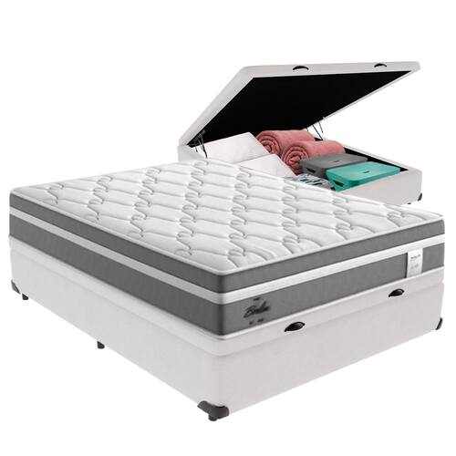 Base Box com Baú: Marca: KazaMix; Cor do Baú: Branco; Material dos pés: Madeira; Estrutura: Madeira; Abertura: Pistão a gás; Peso máximo recomendado: até 150kg de cada lado; Altura do Baú: 32cm; Altura dos pés: 5cm; Altura total: 37cm; Garantia: 03 meses; Selo Ecologicamente Correto.