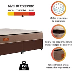 Transforme suas noites de sono com a Cama Azera, ideal para quem valoriza qualidade, conforto e bem-estar. Com capacidade para até 150 kg por pessoa, ela oferece excelente suporte sem abrir mão da maciez. Seu design moderno combina materiais de alta durabilidade com um acabamento elegante. O revestimento lateral em malha e fibra siliconada proporciona toque suave e maior ventilação. Já o Pillow Top, uma camada extra de conforto, garante uma experiência de sono ainda mais acolhedora. As molas ensacadas oferecem sustentação precisa e reduzem a transferência de movimento, proporcionando noites tranquilas. Perfeito para quem busca dormir melhor com estilo e conforto. O Box é feito de suede, o Baú possui um sistema de abertura fácil, onde você terá mais espaço para poder guardar os seus objetos pessoais, roupas, camas, travesseiro, edredons. É excelente para você que busca um produto moderno e prático. Possui estrutura resistente, um belo acabamento, é um produto de fácil limpeza.