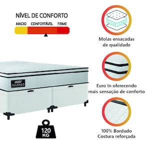 REVESTIMENTO INTERIOR: Molas ensacadas que permitem que o colchão suporte até 120kg por pessoa, oferecendo conforto e estabilidade durante o sono