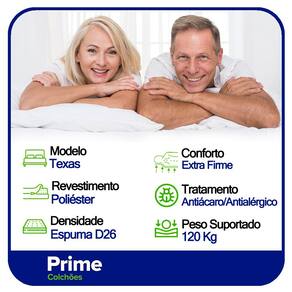 Características do Colchão: - Marca: Prime Colchões - Cor: Marrom/Branco - Espuma: D26 - Modelo: Texas - Tamanho: Casal - Tipo de Molas: Ensacadas - Revestimento Superior: Poliéster - Revestimento Lateral: Poliéster - Capacidade: 120kg por pessoas - Interior: Molas ensacadas, com espuma D26 - Dimensões do colchão (largura x comprimento x altura): 138x188x22cm