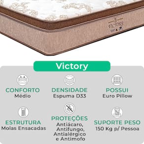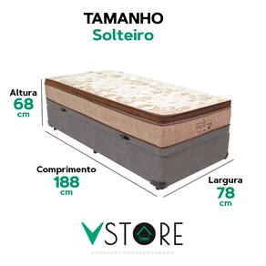 A tecnologia que a sua casa merece está na V-Store! O colchão Victory Solteiro da V-Store oferece noites de sono tranquilas e confortáveis, com seu toque macio e sistema de molas ensacadas que garantem suporte ideal e independência de movimentos. O Pillow Euro Pillow proporciona ainda mais suavidade, enquanto a tecnologia EPS adiciona resistência e durabilidade. Com proteções contra ácaros, fungos, mofo e alergias, ele garante um ambiente de sono saudável. Suporta até 150 kg por pessoa e tem garantia de 12 meses.A Base Box Baú Bravus da V-Store combina praticidade e sofisticação, com madeira reflorestada e revestimento sintético que facilitam a manutenção. Seu design otimiza o espaço de armazenamento e oferece resistência, suportando até 150 kg por pessoa. Com 44 cm de altura total e Selo Ecologicamente Correto, ela é ideal para quem busca sustentabilidade e qualidade. Transforme seu quarto com o colchão Victory e a Base Box Baú Bravus da V-Store!Característica Do Colchão: Modelo: VictoryMarca: V-StoreTamanho: SolteiroDimensões: 78x30x188 (Largura x Altura x Comprimento)Conforto: MédioSistema: Molas EnsacadasPillow: Euro PillowPeso Máximo recomendado: 150 kg (Por pessoa)Proteções: Antiácaro, antialérgico, antifungo, antimofoGarantia: 12 Meses (Espuma) / 10 anos ( Conjunto de Molas Ensacadas)Característica Da Base: Marca: V-StoreModelo: BravusCor do Box: CinzaTamanho: SolteiroDimensões: 78x44x188 (Largura x Altura x Comprimento)Estrutura: MadeiraPeso máximo recomendado: 150 kg (Por Pessoa)Altura do Box: 38 cmAltura dos Pés: 6 cmAltura total: 44 cmGarantia: 12 Meses (Estrutura) / 3 meses (Tecido)Selo Ecologicamente CorretoAtenção:- Antes de finalizar sua compra, recomendamos que verifique se as dimensões do produto são adequadas para serem transportadas pelos elevadores, portas, escadas e corredores de sua residência. Ressaltamos que não nos responsabilizamos pelo transporte do produto por meios específicos, como escadas, guinchos ou içamentos.- É possível que hajam leves variações de cor de acordo com o dispositivo que está sendo utilizado como smartphones, computadores, monitores e outros.