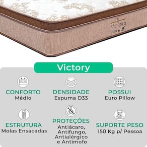 O colchão Victory Solteiro da V-Store oferece noites de sono tranquilas e confortáveis, com seu toque macio e sistema de molas ensacadas que garantem suporte ideal e independência de movimentos. O Pillow Euro Pillow proporciona ainda mais suavidade, enquanto a tecnologia EPS adiciona resistência e durabilidade. Com proteções contra ácaros, fungos, mofo e alergias, ele garante um ambiente de sono saudável. Suporta até 150 kg por pessoa e tem garantia de 12 meses.