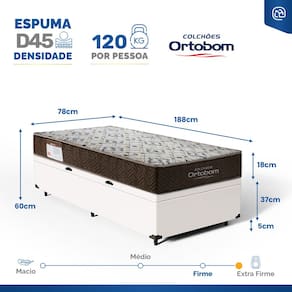Especificações Técnicas Colchão: - Marca: Ortobom; - Proteções: Antiácaro, Antialérgico, Antifungo, Antimofo; - Acabamento: Viscopoli e bordado em matelassê; - Matéria prima: Espuma; - Sistema One Face; - Densidade: D45; - Pillow Top: Não possui; - EPS Poliestireno Expansível: Possui; - Tipo de conforto: Extra Firme; - Peso máximo recomendado: até 120Kg (por pessoa); - Garantia: 12 meses; - Dimensões do produto (largura x comprimento x altura): 78x188x18cm.