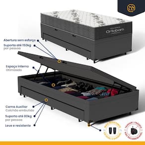 A Base Baú com Auxiliar da Lucas Colchões combina praticidade e durabilidade. A cama auxiliar embutida é uma solução inteligente para otimizar espaço, ideal para visitas ou famílias grandes. Fácil de manusear, pode ser utilizada sempre que necessário e guardada discretamente, mantendo o ambiente organizado. O baú com um super espaço interno, ideal para guardar roupas de cama, edredons, travesseiros, mantas, toalhas e etc. É perfeita para quem busca otimizar espaço sem abrir mão da qualidade e resistência.