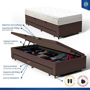 A Base Baú com Auxiliar da Lucas Colchões combina praticidade e durabilidade. A cama auxiliar embutida é uma solução inteligente para otimizar espaço, ideal para visitas ou famílias grandes. Fácil de manusear, pode ser utilizada sempre que necessário e guardada discretamente, mantendo o ambiente organizado. O baú com um super espaço interno, ideal para guardar roupas de cama, edredons, travesseiros, mantas, toalhas e etc. É perfeita para quem busca otimizar espaço sem abrir mão da qualidade e resistência.