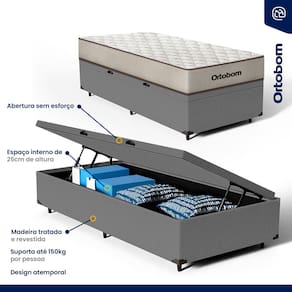 Além do colchão, a base baú incorporada aumenta a funcionalidade do seu quarto, oferecendo um espaço de armazenamento adicional. Construída com madeira tratada, tornando-a não apenas prática mas também durável e resistente. Este conjunto é a solução perfeita para quem busca maximizar o conforto e a utilidade em espaços compactos.