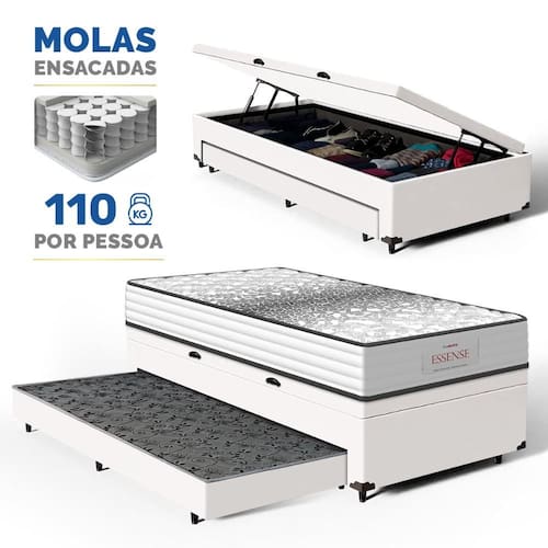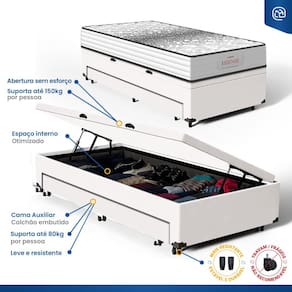 A Base Baú com Auxiliar da Lucas Colchões combina praticidade e durabilidade. A cama auxiliar embutida é uma solução inteligente para otimizar espaço, ideal para visitas ou famílias grandes. Fácil de manusear, pode ser utilizada sempre que necessário e guardada discretamente, mantendo o ambiente organizado. O baú com um super espaço interno, ideal para guardar roupas de cama, edredons, travesseiros, mantas, toalhas e etc. É perfeita para quem busca otimizar espaço sem abrir mão da qualidade e resistência.