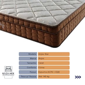 O conforto que sua casa precisa e a qualidade que você merece está na Kazamix! Apresentamos o Colchão Star Pillow In Ortopédico da Anjos, a escolha ideal para quem busca conforto, suporte e um toque extra de luxo. Seu design ortopédico oferece suporte progressivo para a coluna, prevenindo dores nas costas e promovendo o bem-estar durante o sono. O Euro Pillow, uma camada adicional de espuma macia na parte superior, proporciona uma sensação de aconchego e alívio dos pontos de pressão, melhorando ainda mais o conforto. Com revestimento em malha, o colchão garante respirabilidade superior, enquanto o acabamento em veludo nas laterais traz elegância ao produto. O conforto extra firme é perfeito para pessoas até 140kg, oferecendo uma superfície de sono estável e segura. Além disso, o colchão é tratado contra ácaros e fungos, promovendo um ambiente de sono saudável. Invista em noites de sono revitalizantes e desfrute do equilíbrio perfeito entre conforto e qualidade com o Colchão Star Pillow In! Modelo: Anjos Star Pillow In Marca: Anjos Tamanho: Casal Dimensões: 138x188X30 (Largura x Comprimento x Altura) Conforto: Extra Firme Pillow: Pillow Top Peso Máximo recomendado: 140 kg (Por pessoa) Proteções: Antiácaro, antialérgico, antifungo, antimofo Garantia: 1 ano pelo FabricanteO conforto que sua casa precisa e a qualidade que você merece está na Kazamix! Eleve o conforto e a sofisticação do seu quarto com a Cama Box! Produzida em madeira de reflorestamento reforçada, a Cama Box combina qualidade, durabilidade e um design elegante, que confere leveza e modernidade ao seu dormitório. Sua estrutura robusta suporta até 150 kg por pessoa, garantindo a sustentação perfeita para o colchão e prolongando a vida útil do produto. Com uma altura ergonômica, ela oferece maior conforto ao deitar e levantar, enquanto o acabamento de alta qualidade se adapta a qualquer estilo de decoração, unindo praticidade e estilo. Não perca tempo! Adquira agora mesmo a sua Cama Box e transforme seu dormitório com conforto e elegância. Marca: KazaMix Modelo: Box Tamanho: Casal Dimensões: 138X188X35 (Largura x Comprimento x Altura) Estrutura: Madeira Peso máximo recomendado: 150 kg (Por Pessoa) Altura do Box: 25 cm Altura dos Pés: 10 cm Altura total: 35 cm Garantia: 03 meses Selo Ecologicamente Correto Atenção: Antes de finalizar sua compra, certifique-se de que as dimensões do produto sejam adequadas para serem transportadas pelos elevadores, portas, escadas e corredores de sua residência. Ressaltamos que não nos responsabilizamos pelo transporte do produto por meios específicos, como escadas, guinchos ou içamentos.