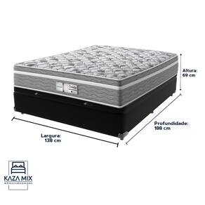 O conforto que sua casa precisa e a qualidade que você merece está na Kazamix! O Colchão Evolution é a escolha ideal para quem busca conforto, suporte e qualidade em cada noite de sono. Com Molas Ensacadas que oferecem um suporte individualizado, e um Pillow Euro que proporciona uma camada extra de suavidade, esse colchão transforma seu descanso em uma experiência de luxo. Com espuma D28 de alta densidade, o Evolution garante firmeza e conforto duradouros. Seu acabamento em poliéster diamante e bordado em matelassê trazem um toque de elegância e sofisticação ao seu ambiente. Além disso, o colchão é tratado com propriedades antiácaro e antialérgico, garantindo um sono mais saudável e seguro. Invista no seu bem-estar com o colchão Evolution, e experimente a combinação perfeita de conforto e durabilidade! Modelo: Evolution Marca: Probel Tamanho: Casal Dimensões: 138x188X32 (Largura x Comprimento x Altura) Conforto: Intermediário Sistema: Molas Ensacadas Pillow: Euro Pillow Peso Máximo recomendado: 110 kg (Por pessoa) Proteções: Antiácaro, antialérgico, antifungo, antimofo Garantia: 1 ano pelo FabricanteO conforto que sua casa precisa e a qualidade que você merece está na Kazamix Aproveite cada metro quadrado do seu dormitório com a Cama Box Baú! Projetada com madeira de reflorestamento reforçada, a Cama Box Baú é a escolha ideal para quem busca otimização de espaço e praticidade na organização do dia a dia. Com um baú generoso, ela oferece a solução perfeita para armazenar travesseiros extras, cobertores, malas e muito mais. Além disso, sua estrutura robusta suporta até 150 kg por pessoa, garantindo a sustentação ideal para o seu colchão e prolongando sua vida útil. O pistão a gás robusto proporciona uma abertura suave e segura do baú, oferecendo praticidade e resistência no uso diário. Para completar, o acabamento de alta qualidade combina perfeitamente com qualquer estilo de decoração, agregando elegância e versatilidade ao seu ambiente. Não perca tempo! Adquira agora mesmo sua Cama Box Baú e diga adeus à falta de espaço e desorganização. Marca: KazaMix Modelo: Baú Tamanho: Casal Dimensões: 138X188X37 (Largura x Comprimento x Altura) Estrutura: Madeira Peso máximo recomendado: 150 kg (Por Pessoa) Altura do Box: 32 cm Altura dos Pés: 5 cm Altura total: 37 cm Garantia: 03 meses Selo Ecologicamente Correto Atenção: Antes de finalizar sua compra, certifique-se de que as dimensões do produto sejam adequadas para serem transportadas pelos elevadores, portas, escadas e corredores de sua residência. Ressaltamos que não nos responsabilizamos pelo transporte do produto por meios específicos, como escadas, guinchos ou içamentos.