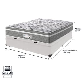 O conforto que sua casa precisa e a qualidade que você merece está na Kazamix! O Colchão Evolution é a escolha ideal para quem busca conforto, suporte e qualidade em cada noite de sono. Com Molas Ensacadas que oferecem um suporte individualizado, e um Pillow Euro que proporciona uma camada extra de suavidade, esse colchão transforma seu descanso em uma experiência de luxo. Com espuma D28 de alta densidade, o Evolution garante firmeza e conforto duradouros. Seu acabamento em poliéster diamante e bordado em matelassê trazem um toque de elegância e sofisticação ao seu ambiente. Além disso, o colchão é tratado com propriedades antiácaro e antialérgico, garantindo um sono mais saudável e seguro. Invista no seu bem-estar com o colchão Evolution, e experimente a combinação perfeita de conforto e durabilidade! Modelo: Evolution Marca: Probel Tamanho: Casal Dimensões: 138x188X32 (Largura x Comprimento x Altura) Conforto: Intermediário Sistema: Molas Ensacadas Pillow: Euro Pillow Peso Máximo recomendado: 110 kg (Por pessoa) Proteções: Antiácaro, antialérgico, antifungo, antimofo Garantia: 1 ano pelo FabricanteO conforto que sua casa precisa e a qualidade que você merece está na Kazamix Aproveite cada metro quadrado do seu dormitório com a Cama Box Baú! Projetada com madeira de reflorestamento reforçada, a Cama Box Baú é a escolha ideal para quem busca otimização de espaço e praticidade na organização do dia a dia. Com um baú generoso, ela oferece a solução perfeita para armazenar travesseiros extras, cobertores, malas e muito mais. Além disso, sua estrutura robusta suporta até 150 kg por pessoa, garantindo a sustentação ideal para o seu colchão e prolongando sua vida útil. O pistão a gás robusto proporciona uma abertura suave e segura do baú, oferecendo praticidade e resistência no uso diário. Para completar, o acabamento de alta qualidade combina perfeitamente com qualquer estilo de decoração, agregando elegância e versatilidade ao seu ambiente. Não perca tempo! Adquira agora mesmo sua Cama Box Baú e diga adeus à falta de espaço e desorganização. Marca: KazaMix Modelo: Baú Tamanho: Casal Dimensões: 138X188X37 (Largura x Comprimento x Altura) Estrutura: Madeira Peso máximo recomendado: 150 kg (Por Pessoa) Altura do Box: 32 cm Altura dos Pés: 5 cm Altura total: 37 cm Garantia: 03 meses Selo Ecologicamente Correto Atenção: Antes de finalizar sua compra, certifique-se de que as dimensões do produto sejam adequadas para serem transportadas pelos elevadores, portas, escadas e corredores de sua residência. Ressaltamos que não nos responsabilizamos pelo transporte do produto por meios específicos, como escadas, guinchos ou içamentos.