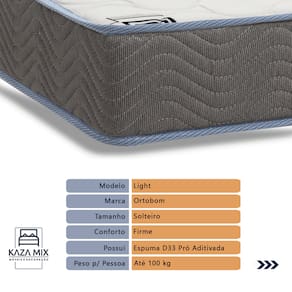 O conforto que sua casa precisa e a qualidade que você merece está na Kazamix! Descubra o Colchão Ortobom Light D33, perfeito para quem busca resistência e conforto. Com sua espuma D33 Pró Aditivada de Alta Performance, ele oferece sustentação firme e durabilidade superior, ideal para noites de sono tranquilas e revigorantes. O tampo com bordado em Matelassê proporciona um toque extra de conforto, enquanto o revestimento em Viscopoli garante suavidade e elegância. Além disso, este modelo conta com tratamento antiácaro e antialérgico, promovendo um ambiente de descanso mais saudável e livre de impurezas. Fabricado com a qualidade reconhecida da Ortobom, o Light D33 é a escolha ideal para quem valoriza bem-estar e durabilidade. Transforme suas noites com o conforto que você merece! Modelo: Light Marca: Ortobom Tamanho: Solteiro Dimensões: 88x188X18 (Largura x Comprimento x Altura) Conforto: Firme Sistema: Espuma D33 Pillow: Não se Aplica Peso Máximo recomendado: 100 kg (Por pessoa) Proteções: Antiácaro, antialérgico, antifungo, antimofo Garantia: 1 ano pelo FabricanteO conforto que sua casa precisa e a qualidade que você merece está na Kazamix Aproveite cada metro quadrado do seu dormitório com a Cama Box Baú! Projetada com madeira de reflorestamento reforçada, a Cama Box Baú é a escolha ideal para quem busca otimização de espaço e praticidade na organização do dia a dia. Com um baú generoso, ela oferece a solução perfeita para armazenar travesseiros extras, cobertores, malas e muito mais. Além disso, sua estrutura robusta suporta até 150 kg por pessoa, garantindo a sustentação ideal para o seu colchão e prolongando sua vida útil. O pistão a gás robusto proporciona uma abertura suave e segura do baú, oferecendo praticidade e resistência no uso diário. Para completar, o acabamento de alta qualidade combina perfeitamente com qualquer estilo de decoração, agregando elegância e versatilidade ao seu ambiente. Não perca tempo! Adquira agora mesmo sua Cama Box Baú e diga adeus à falta de espaço e desorganização. Marca: KazaMix Modelo: Baú Tamanho: Solteiro Dimensões: 88X188X37 (Largura x Comprimento x Altura) Estrutura: Madeira Peso máximo recomendado: 150 kg (Por Pessoa) Altura do Box: 32 cm Altura dos Pés: 5 cm Altura total: 37 cm Garantia: 03 meses Selo Ecologicamente Correto Atenção: Antes de finalizar sua compra, certifique-se de que as dimensões do produto sejam adequadas para serem transportadas pelos elevadores, portas, escadas e corredores de sua residência. Ressaltamos que não nos responsabilizamos pelo transporte do produto por meios específicos, como escadas, guinchos ou içamentos.O conforto que sua casa precisa e a qualidade que você merece está na Kazamix! Descubra o Colchão Ortobom Light D33, perfeito para quem busca resistência e conforto. Com sua espuma D33 Pró Aditivada de Alta Performance, ele oferece sustentação firme e durabilidade superior, ideal para noites de sono tranquilas e revigorantes. O tampo com bordado em Matelassê proporciona um toque extra de conforto, enquanto o revestimento em Viscopoli garante suavidade e elegância. Além disso, este modelo conta com tratamento antiácaro e antialérgico, promovendo um ambiente de descanso mais saudável e livre de impurezas. Fabricado com a qualidade reconhecida da Ortobom, o Light D33 é a escolha ideal para quem valoriza bem-estar e durabilidade. Transforme suas noites com o conforto que você merece! Modelo: Light Marca: Ortobom Tamanho: Solteiro Dimensões: 88x188X18 (Largura x Comprimento x Altura) Conforto: Firme Sistema: Espuma D33 Pillow: Não se Aplica Peso Máximo recomendado: 100 kg (Por pessoa) Proteções: Antiácaro, antialérgico, antifungo, antimofo Garantia: 1 ano pelo FabricanteO conforto que sua casa precisa e a qualidade que você merece está na Kazamix Aproveite cada metro quadrado do seu dormitório com a Cama Box Baú! Projetada com madeira de reflorestamento reforçada, a Cama Box Baú é a escolha ideal para quem busca otimização de espaço e praticidade na organização do dia a dia. Com um baú generoso, ela oferece a solução perfeita para armazenar travesseiros extras, cobertores, malas e muito mais. Além disso, sua estrutura robusta suporta até 150 kg por pessoa, garantindo a sustentação ideal para o seu colchão e prolongando sua vida útil. O pistão a gás robusto proporciona uma abertura suave e segura do baú, oferecendo praticidade e resistência no uso diário. Para completar, o acabamento de alta qualidade combina perfeitamente com qualquer estilo de decoração, agregando elegância e versatilidade ao seu ambiente. Não perca tempo! Adquira agora mesmo sua Cama Box Baú e diga adeus à falta de espaço e desorganização. Marca: KazaMix Modelo: Baú Tamanho: Solteiro Dimensões: 88X188X37 (Largura x Comprimento x Altura) Estrutura: Madeira Peso máximo recomendado: 150 kg (Por Pessoa) Altura do Box: 32 cm Altura dos Pés: 5 cm Altura total: 37 cm Garantia: 03 meses Selo Ecologicamente Correto Atenção: Antes de finalizar sua compra, certifique-se de que as dimensões do produto sejam adequadas para serem transportadas pelos elevadores, portas, escadas e corredores de sua residência. Ressaltamos que não nos responsabilizamos pelo transporte do produto por meios específicos, como escadas, guinchos ou içamentos.