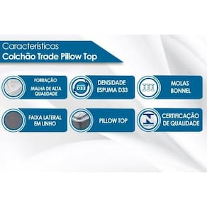 Dimensões(Cm): Comnto(Profundidade): 203cm x Largura: 193cm x Altura: 30cm Vantagens Extras de Colchão - c/ Sistema Polyframe Tipo de Pillow - Pillow Top Americano Tecido com Tratamento do Colchão - AntiÁcaro e AntiFungo Bordado do Revestimento do Colchão - Contínuo Forração Revestimento do Colchão - Malha de Alta Qualidade Forração do Revestimento Inferior do Colchão - Antiderrapante Tecido de Revestimento da Faixa Lateral do Colchão - Decorativa Modo de Utilização do Colchão - One Side Camadas Interna do Estofamento de Espuma do Colchão - Alta Qualidade Tipo de Mola do Colchão - Bonnel Nível de Firmeza do Colchão - Macio c/ Firmeza Peso Máximo Suportado do Colchão - 120 kg Certificação de Qualidade do Colchão - Qualidade Aprovada - INMETRO - Qualidade Costa Rica - Selo Abicol - INER Pró Espuma Nossa Avaliação do Colchão - Qualidade Muito Boa Tempo de Garantia do Colchão - 12 meses